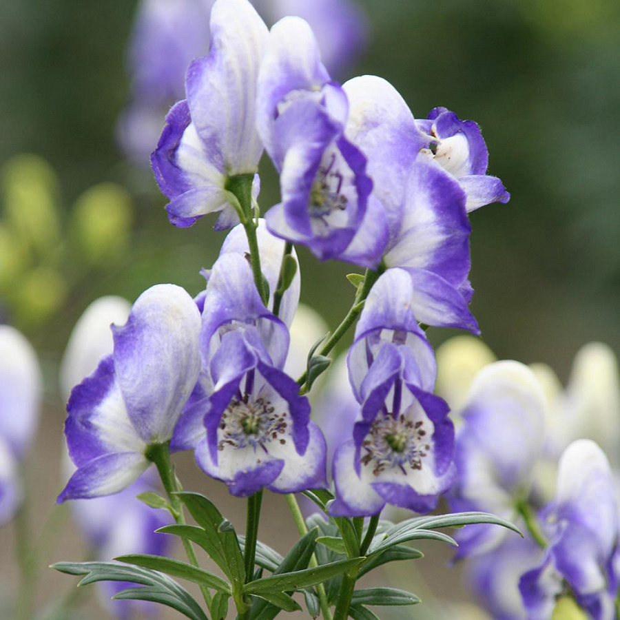 Саженцы Аконита (Борца) клубочкового Клоуди (Cloudy) подходят для выращивания в умеренном климате, он прекрасно зимует под снегом. Крупный многолетник, высотой до 100 сантиметров, отлично смотрится в компании астильбы, лиллейников, ириса. Часто его размещают однородной группой на газоне. Цветки аканита Клоуди формой напоминают миниатюрную орхидею, длиной не более 3 сантиметров. Лепестки белоснежные, с ярко-синей окантовкой по краю. Собраны бутоны в пышные кистевые соцветия. Любоваться цветением борца можно с июля по сентябрь.