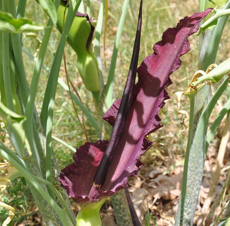 - Стебли мясистые с пятнами коричневого цвета. Из-за этих коричневых пятен создается эффект змеиной кожи. Соцветие на стебле появляется в начале лета и представляет собой початок с покрывалом. Покрывало - волнистое по краям и его длина 45 см. Оно бледно-зеленое снаружи, а внутри – пурпурно-багровое. Початок тоже 45 см, а цвет темно-красный.