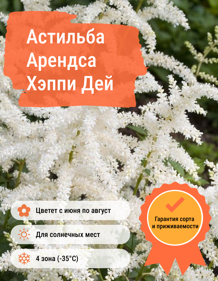 Астильба Арендса Хэппи Дей - это удивительное растение, которое поразит вас своей красотой и изяществом. Ее темно-зеленые листья создают прекрасный контраст с нежными белыми цветками, расцветающими в июне, июле и августе. Высота этого растения может достигать до 40 см, что делает его идеальным выбором для групповых или одиночных посадок в солнечных местах.