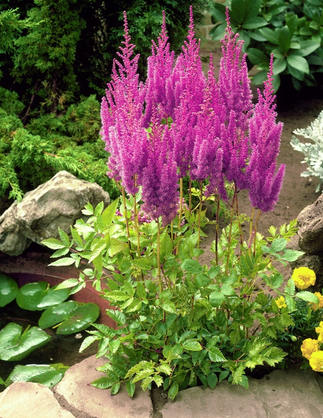 Рассада астильбы китайской Суперба (Superba) – привлекательный сорт, характерный стремящимися вверх побегами, густо усеянными розово-фиолетовыми цветками. Ажурные метелки становятся пушистыми по мере распускания сотен мелких бутонов. Черенки прямые и ровные, светло-зеленого цвета. Резная листва с зубчатыми краями расположена низко от корней.