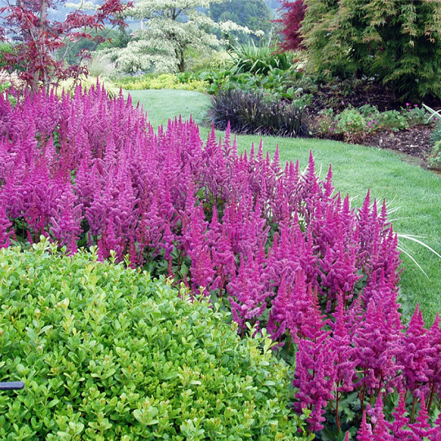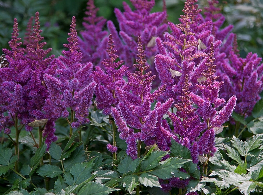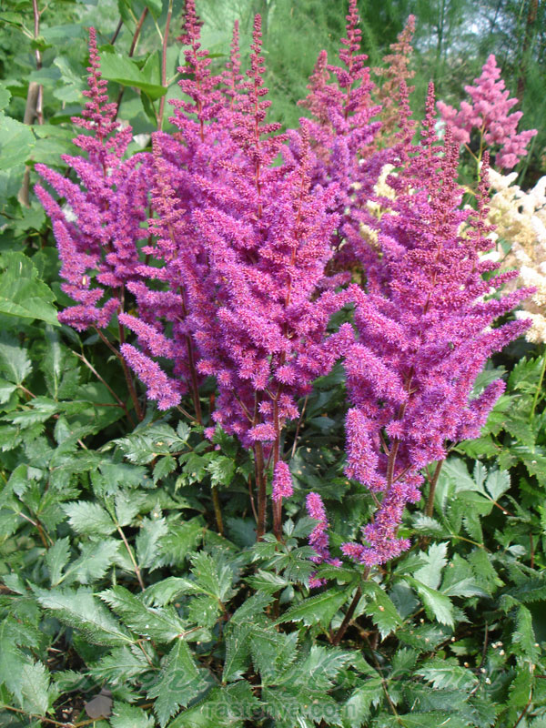 Астильба сорта Visions (Висионс) отличается своим красивым фиолетово-пурпурным оттенком цветов. Это китайский сорт, благодаря чему он имеет густой плотный кустарник до 75 см в высоту. Он идеально подойдет для украшения бордюров и внешнего вида цветников. Соцветия растения ромбической формы, большие и пушистые. Листья переливаются на солнце, они бронзово-зеленого оттенка, ажурные. Астильба Висионс хорошо растет на солнечных участках. Для кустарника характерна большая продолжительность периода цветения в сравнении с другими более старыми сортами. Растение нормально переносит зиму и без укрытия, любит достаточное увлажнение.
