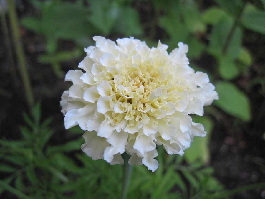 Семена Бархатцев Сноудрифт (Snoudrift) образуют растения с нестандартной для этой культуры окраской шаровидного густомахрового цветка. Скрученные в трубочку лепестки белые, в центре бутона имеют кремово-зеленоватый оттенок. Высота ветвистого кустика 50 сантиметров, ажурная листва сочного зеленого оттенка удачно оттеняет крупные цветки. Бутоны на нем образуются непрерывно, с июня до наступления холодов.