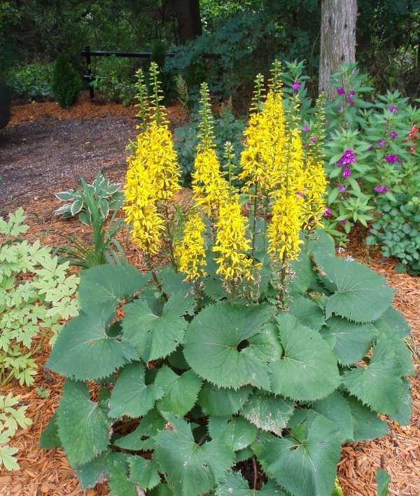 Рассада бузульника пржевальского – высокое растение, которое зацветает яркими желтыми цветками, собранными в высокие свечки соцветий. Его крупные ярко-зеленые резные листья создают фон для низкорослых цветов и эффектно выглядят сами по себе. Бузульник идеально подходит для отдаленных затененных участков сада, позволяя закрыть неприглядные участки – стройку, необустроенную часть цветника.
