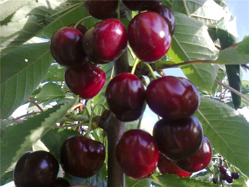 Саженцы черешни Оленька (и крупномеры) быстро достигают высокой рослости, формируют хорошую облиственную крону. С 4 года вяжут первые ягоды, достигая в течение нескольких лет урожайности в 30-40 кг с дерева. С середины июня идет созревание ягод солидного размера (до 8 г) почти черного цвета. Уровень сахаров ягод и интенсивность окраски варьируется. Мякоть не сильно плотная, с явными прожилками, благородного вкуса и аромата.