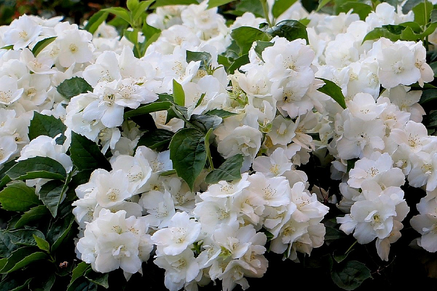 Саженцы чубушника гибридного Виргинал (Virginal) представляют собой сложный гибрид из нескольких видов кустарника. Отличается широким раскидистым кустом с сочно-зелеными листьями, который в высоту может достигать 2,5 м. Соцветия у этого кустарника очень красивые и изящные. На одной веточке собрано несколько белоснежных махровых цветков в окружении темной листвы. Аромата практически не имеет. Крупномер чубушника гибридного Виргинал способен за пару лет достигнуть размеров взрослого растения. Появление безупречных соцветий можно наблюдать с конца июня и до середины июля.