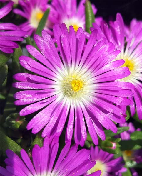 Саженцы Делоспермы Купера Сантропик Парпл (Suntropic Purple) разрастаются в плотные ярко-зеленые куртины, состоящие из узких мясистых стеблей и листьев, растущих вверх. В мае на растении появляются многочисленные цветки с узкими лепестками. Цвет их пурпурно-лиловый, у основания ярко-желтый. Цветение обильное, длится более месяца. Цветущий суккулент не превышает в высоту 15 сантиметров, ширина кустика может достигать полуметра. Растение высаживают в каменистом саду, на альпийской горке в компании молодил, очитков, лилий, злаков. Красиво смотрится делосперма в вазоне, в обрамлении крупной гальки.