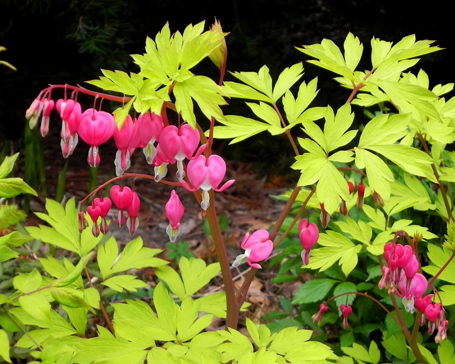 Рассада Дицентры великолепной Gold Heart (Голд Харт) усеяна ажурными желто-зелеными листьями. Формирует среднего размера куст высотой до 100 см. Растение зимостойкое, однако чувствительно к солнечным ожогам. Украсит любой весенний цветник необыкновенным сочетанием золотистых листьев с яркими дорожками элегантных розовых сердцеподобных цветков, подрагивающих от ветерка. Цветет около месяца в конце весны, затем вся наземная зеленая масса отмирает. Семена используют при выведении нового сорта.