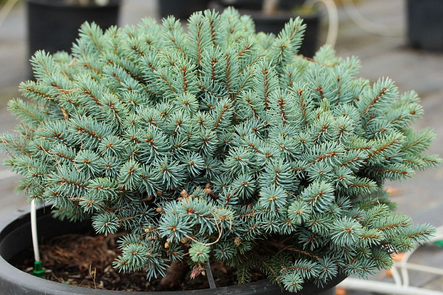 Саженцы Ели голубой Блу Киссен (Blue Kissen) широко применяют в живых изгородях, на альпийских горках и многих других композициях в качестве солитера благодаря круглогодичной декоративности. Взрослые растения, выросшие из саженцев и крупномеров, в возрасте тридцати лет могут достичь 3,5 м в высоту. Крона данного сорта шаровидная, но с течением времени становится широкопирамидальной. Сорт отличается: