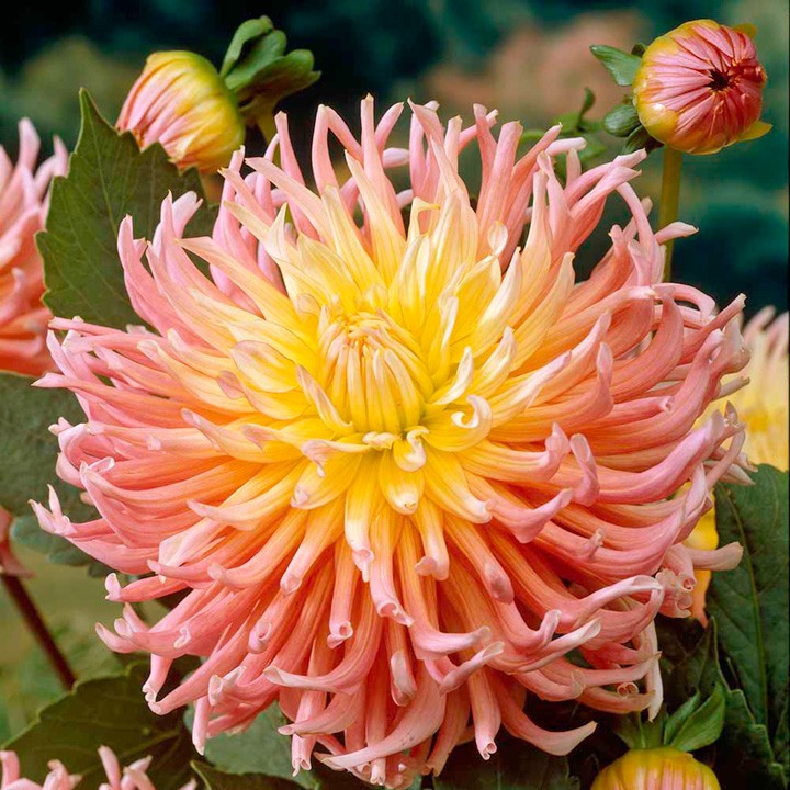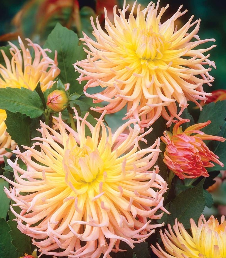 Георгина кактусовая эприкот стар - это изысканное растение с абрикосовыми цветками, которые будут радовать вас своим великолепием в течение нескольких месяцев в году. Ее ствол прочный и устойчивый, а размеры растения позволяют разместить его как в саду, так и на балконе или террасе. Листья георгины имеют интересную форму, что делает ее еще более привлекательной для глаз.