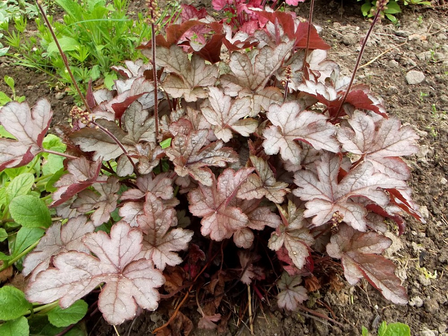 Рассада гейхереллы Гансмоук (Gunsmoke) привлекает внимание фиолетово-красными листьями необычной формы. Летом на кустах появляются нежные кремово-белые цветы. Эффектный многолетник будет служить украшением с ранней весны до поздней осени. Он отлично сочетается с геранями, розами и астибальдой.