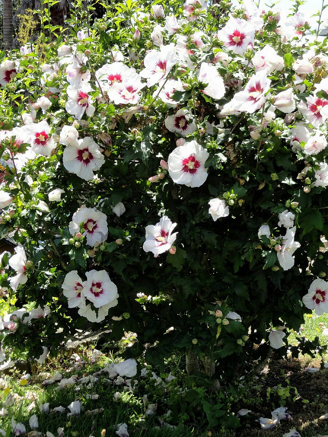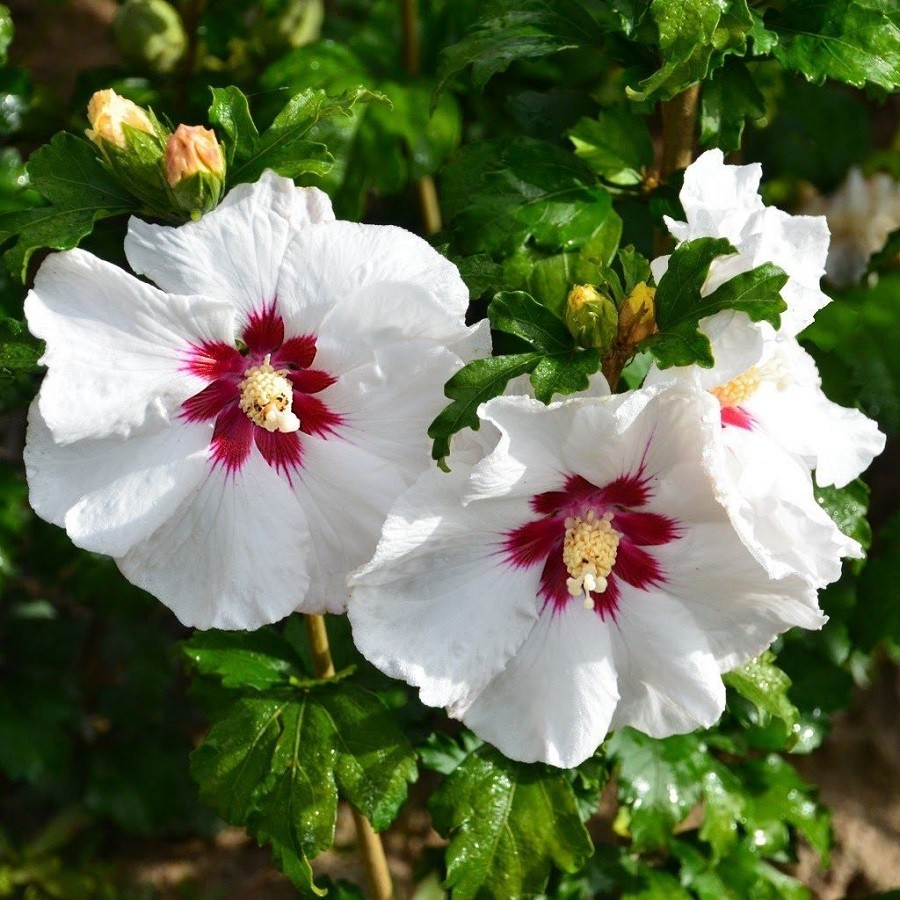 Саженцы гибискуса Рэд Хат (Red Heart) имеют крупную, овальную, трехлопастную листву. Стебли прямостоячие, крепкие вырастают около 2 метров в высоту. В июне идо конца сентября цветет крупными цветами белого окраса с красной серединкой, что выглядит очень контрастно и ярко. Куст густой и ветвистый. Плюсы гибискуса Рэд Хат: