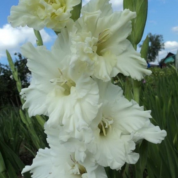 Гладиолус гофрированный сноуи раффл - это великолепное растение, которое поразит вас своей изысканной красотой. Его стебель высотой от 80 до 110 см украшен нежными белоснежными цветками, создающими впечатление пушистых облаков. Листья гладиолуса имеют элегантную форму и придают растению особый шарм.