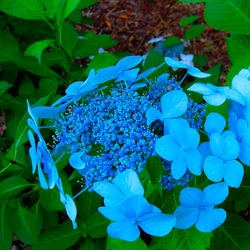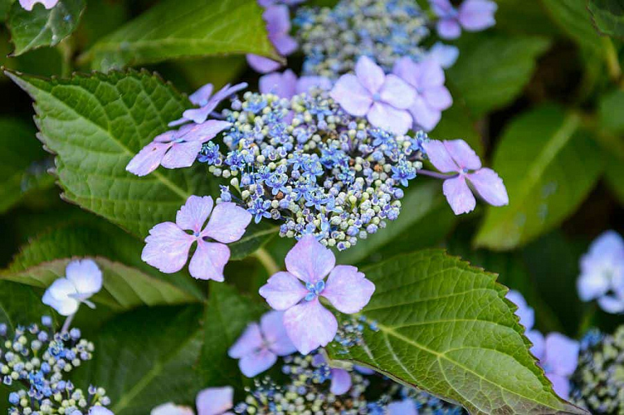 Саженцы гортензии пильчатой сорта Голубая Птица/Блю Берд (Bluebird) высоко ценятся за декоративные качества. В период цветения (с июля по октябрь) светло-зеленый кустарник покрывается плоскими соцветиями шириной около 10 см. Особенности крупномера гортензии Голубая Птица/Блю Берд: в ширину и высоту куст достигает 120 см; цветы – середина соцветий пурпурная, а крайние цветы имеют светло-лиловый, синий или светло-фиолетовый оттенок; листва – основная масса светло-зеленая, а некоторые листья окрашены красным. Саженцы гортензии Голубая Птица/Блю Берд неприхотливы, но состав почвы влияет на окраску цветов.