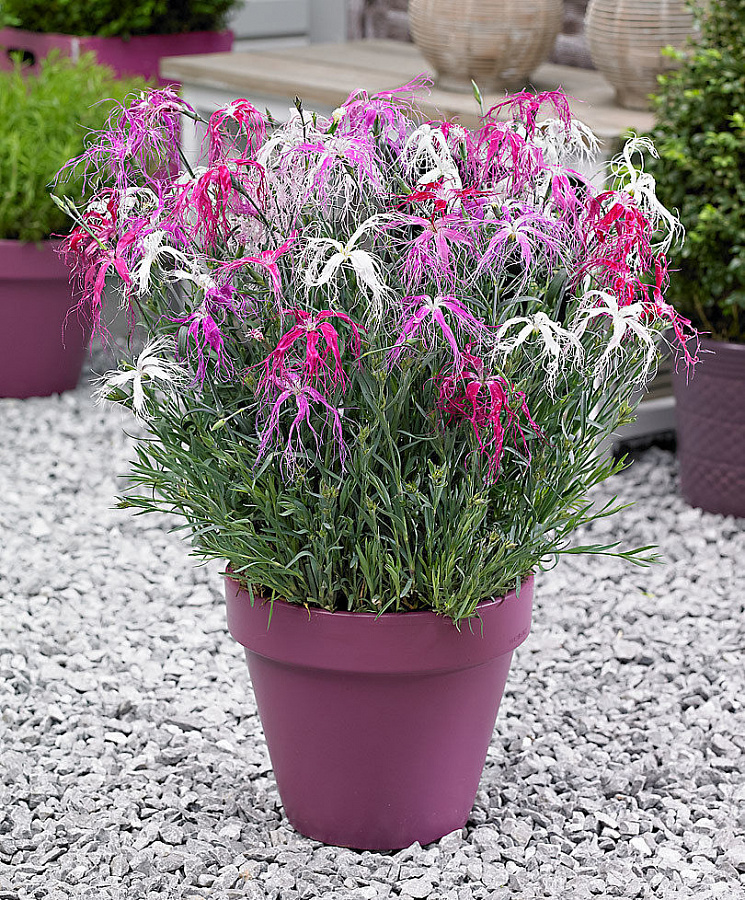 Рассада гвоздики гибридной Dancing Geisha (Dianthus) идеально подходит для выращивания в рабатках, контейнерах, оформления альпийских горок и рокариев. Взрослое растение в высоту достигает 30-40 см, а в диаметре – 15-20 см. Цветет обильно на протяжении 85-90 дней. Цветочек отличается необычным видом: он немахровый, диаметром до 3,5 см, состоит из пяти лепестков с сильно рассеченными краями. На протяжении всего цветения от гвоздики гибридной Dancing Geisha исходит тонкий приятный аромат. Уход за многолетником заключается в регулярном поливе, так как растение влаголюбивое.