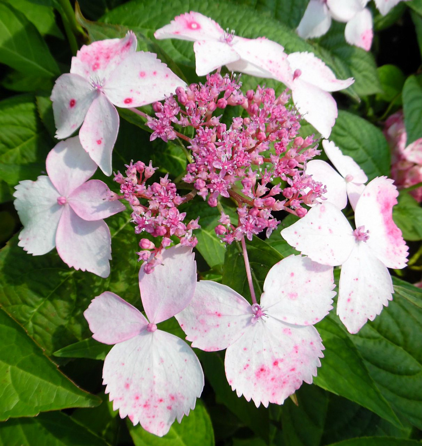 Гортензия пильчатой Оамача имеет маленькие соцветия плоской формы. Обильное цветение продолжается с июня по август. У гортензии листва, которая весной окрашена в фиолетовый цвет, летом зеленеет, а осенью становится пурпурной. Предпочитает освещенные места и дренированный грунт. Важно не допускать избыток влаги в почве.
