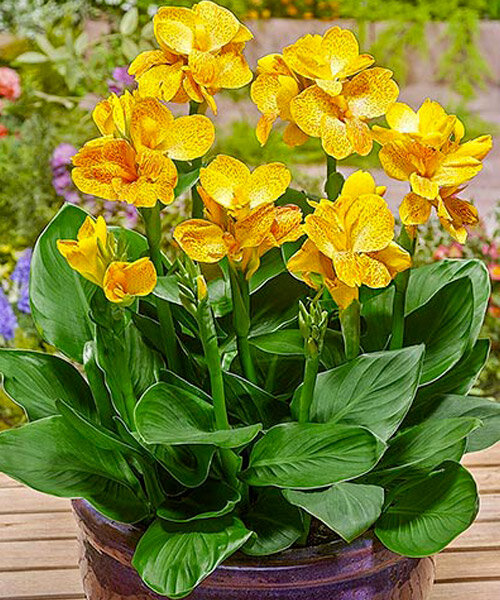 Луковицы Канны горшечной Хэппи Эмили (Canna Happy Emily) это лучший выбор для украшения своего сада. В течение всего лета и осени, благодаря Канне, дом и сад будут утопать в райских цветах. Броские и крупные до 80 сантиметров в высоту, с красивыми листьями и огромными до 13 сантиметров желтыми цветами (с нежным крапом) - они не оставят равнодушными никого. Цветы подойдут для оформления ландшафтного дизайна в клумбах, патио, высадки в вазоны, кашпо и для оформления балконов, террас, высаживая в отдельные горшки. Растение просто в уходе, его достаточно высадить на солнечное место, регулярно поливать, подкармливать и снимать увядшие лепестки.