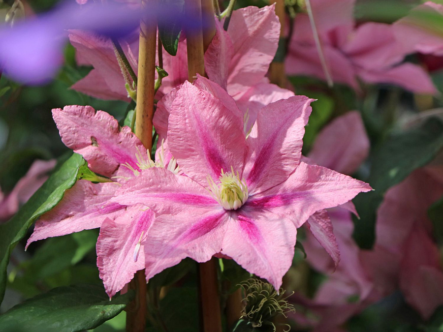 Саженцы клематиса гибридного Розамунде (Rosamunde) не требуют сложного ухода, предпочитают хорошо освещенные не жаркие места с плодородными почвами. Уход заключается в умеренном поливе, подкормках и ежегодной обрезке. Цветение беспрерывное и обильное, длится с июня по август.  Цветки в диаметре достигают 8-12 см, лососево-розового окраса с розовой полосой в центре каждого лепестка. Клематис гибридный Розамунде (Rosamunde) достигает высоты 100-150 см, используется для декорирования и оформления небольших садовых опор, в сочетании с карликовыми деревьями, миниатюрными кустарниками и полукустарниками.