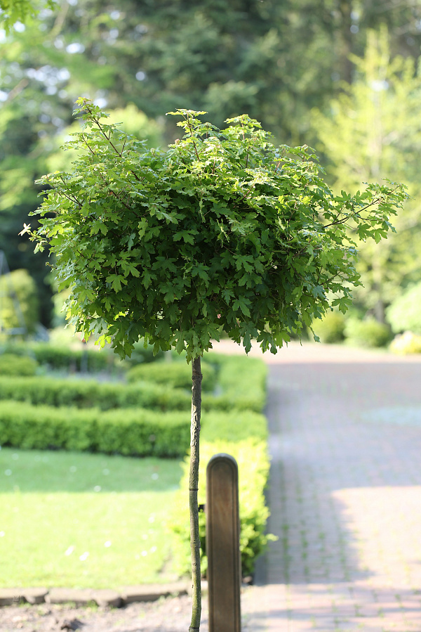 Саженцы клена полевого Нанум (Nanum) – сорт листопадных деревьев с изысканной естественной геометрией крон. На стройных прямых стволах молодых крупномеров эффектно покоятся круглые шапки из зеленой листвы. Взрослое растение вырастает в 2-3 м высоты. С возрастом крона становится более раскидистой и рыхлой. Цветет дерево мелкими желтыми соцветиями. Плодоносит клен полевой Нанум семенами-крылатками.