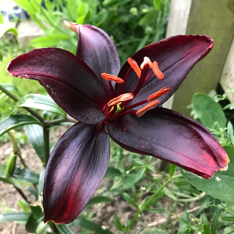 Крупные цветы темно-бордового, почти черного к середине оттенка имеют глянцевый блеск и ярко-оранжевые пыльники. На высоком (до 100 см) стебле одновременно распускается от 5 до 7 цветков. Куин ов Найт полюбилась цветоводам за свой длительный ― с июня по сентябрь – срок цветения и легкость размножения.