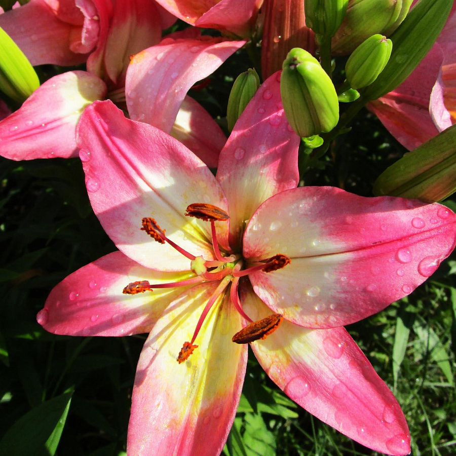 Окраска цветка : цветки двухцветной окраски: середина белоснежная с мелкими коричневатыми вкраплениями, а кончики лепестков малиново-розовые