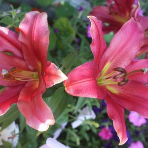 Окраска цветка : цветы темно-розовые, по центру с желто-зеленой звездочкой, лепестки широкие, слегка волнистые с загнутыми краями