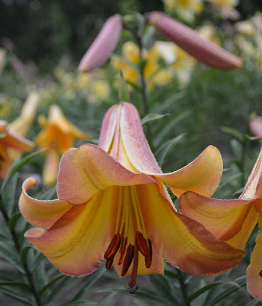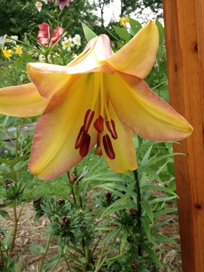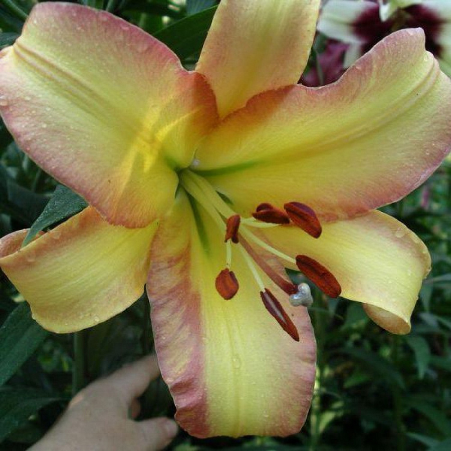Окраска цветка : желтый с палево-розовой каймой и темными пыльниками