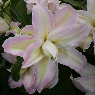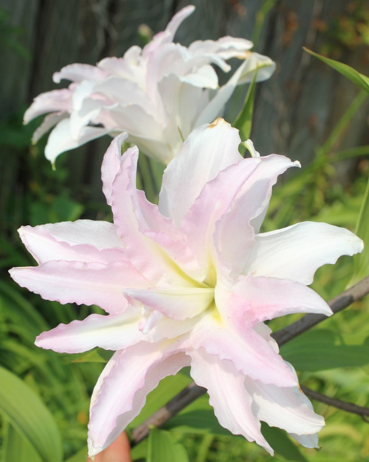 Лилия восточная махровая дабл измаил - это настоящая жемчужина среди садовых растений. Ее стебель уверенно поднимается к небу, словно стремясь к солнцу, а великолепные цветки белого цвета с нежным розовым краем и желтоватой полосой по центру наполняют сад невероятным ароматом. Листья лилии имеют изящную форму, создавая уникальный контраст с цветками.