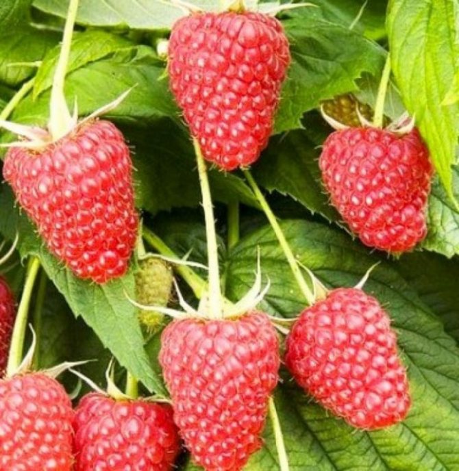 Каждый крупномер малины способен дать около 4 кг плодов за сезон. Ягоды крупные и немного удлиненные. Созревшие плоды источают невероятный аромат и не опадают с плодоножки. Саженцы малины данного сорта не имеют шипов. Кустарник неприхотлив. Поэтому его могут смело приобретать даже начинающие садоводы без соответствующего опыта.