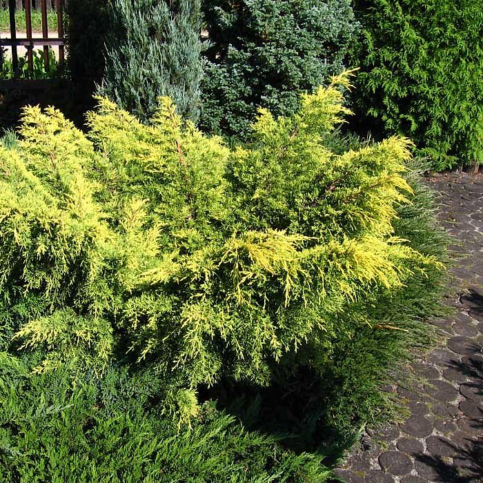 Саженцы можжевельника среднего Кинг оф Спринг (King of Spring) переносят перепады температур, поэтому хорошо выдерживают как морозы, так и засушливое время года. Вырастают в среднем на 10-15 см в год, выделяются своей желтой окраской хвои. Очень красиво смотрятся в ландшафтных композициях. Кустарник неприхотлив к внешним условиям и может произрастать практически на всех типах почв. Порадуйте себя, купив роскошные можжевеловые саженцы и крупномеры на нашем сайте!