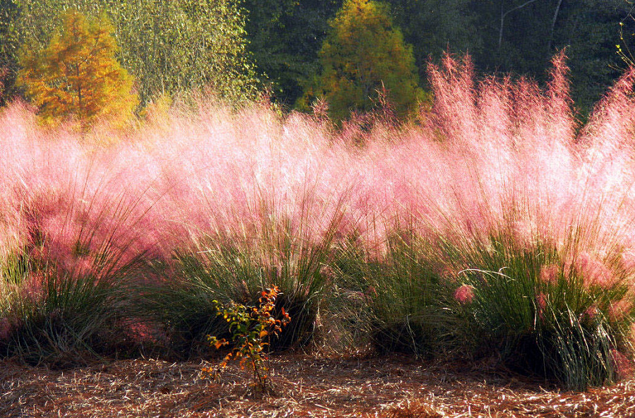 Рассада мюленбергии волосовидной отлично разрастается на солнечных или частично притененных участках. Растение неприхотливо, засухоустойчиво, в дополнительном поливе не нуждается. Хорошо переносит разнообразные почвы: от влажных до сухих, от кислых до щелочных. Чаще всего мюленбергию волосовидную используют в бордюрах, в центре или на заднем плане клумб с другими многолетниками. Пурпурно-красные или розовые соцветия появляются в середине или конце лета. Они представляют собой шелковистые метелки 45,7 см в длину и 25,4 см в ширину. Цветение сохраняется в течение 6-8 недель.