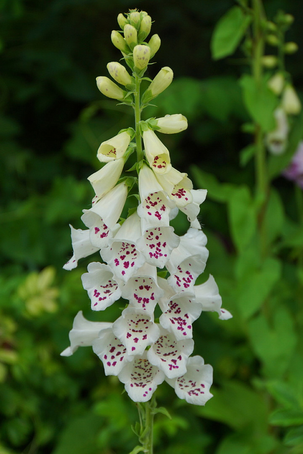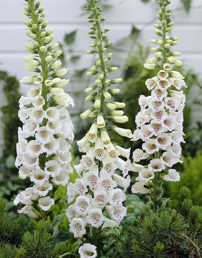 Рассада наперстянки Далматин Вайт (Dalmatian White) обладает прямыми, достаточно крепкими стеблями, которые вырастают около 80-110 см в высоту. Листва продолговатая, зеленого оттенка. Цветы неправильной формы, колокольчатые. В июне-августе зацветает белым цветом с темными крапинками внутри колокольчика, что выглядит очень эффектно. Плюсы наперстянки Далматин Вайт: