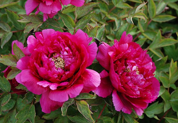 - Пионы используются для посадки многолетних клумб или создания групп растений. Они хорошо сочетаются с лилейниками, астрами или другими луковичными растениями.