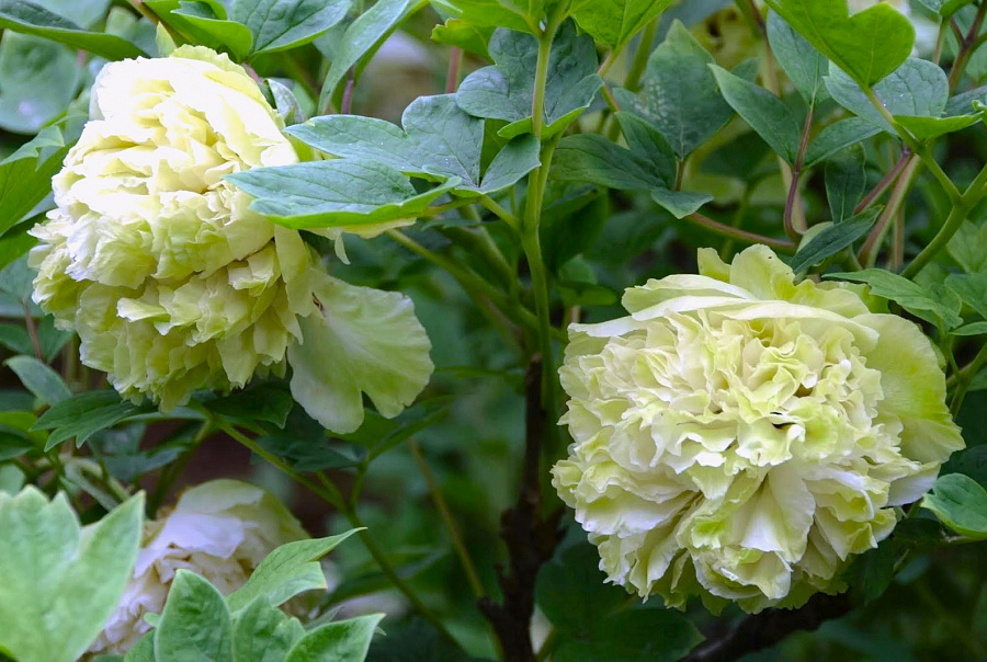 Саженцы пиона древовидного Green Jade (Lu Mu Ying Yu ) Оригинальные, махровые цветы окрашены, бледно-зеленые изогнутыми лепестками, но позже полностью белый, но иногда у взрослых цветков в форме короны сохраняется зеленоватый оттенок. В самом центре бутона лепестки плотно прилегают друг к другу. Нежным- тонким аромат. Этот цветущий кустарник в зрелом возрасте представляет собой захватывающее зрелище, заслуживающее особого расположения в саду. Длинные стебли с темно зелеными, тонкими листьями и крепкими ветвями. Древовидный пион открывает всю свою красоту, распуская пышные бутоны. Их лепестки удивляют нежностью и тонкостью, а также привлекают взгляд необычной окраской. Древовидные пионы обладает не сильным, но приятным и нежным ароматом. В отличие от травянистого пиона стебли такого растения в осеннее время не увядают, а с каждым годом разрастаются все больше, и со временем кустик приобретает полушаровидную форму. Характерные особенности растения: