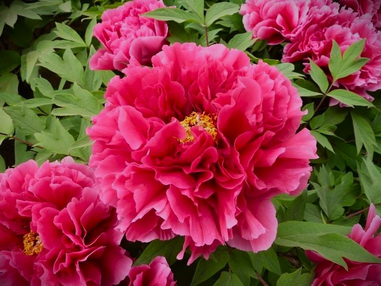 • Пионы используются для посадки многолетних клумб или создания групп растений,а также вдоль забора и стен. Они хорошо сочетаются с лилейниками, астрами или другими луковичными растениями.