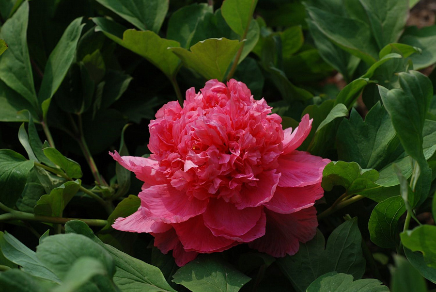 Саженцы пиона древовидного Красный Шар используются для одиночной посадки или для создания красочных композиций с другими растениями. Кустарник с поздними сроками цветения морозоустойчив, в высоту вырастает до 1,5 метра, обильно покрыт листьями ярко-зеленого цвета. На одном кусте может одновременно распускаться до 70 красных с фиолетовыми кончиками лепестков цветков (диаметр до 18 сантиметров). Продолжительность цветения составляет почти две недели. После того как пион отцветает, он не теряет своей привлекательности благодаря листьям красивой формы. Цветки порадуют приятным ароматом.
