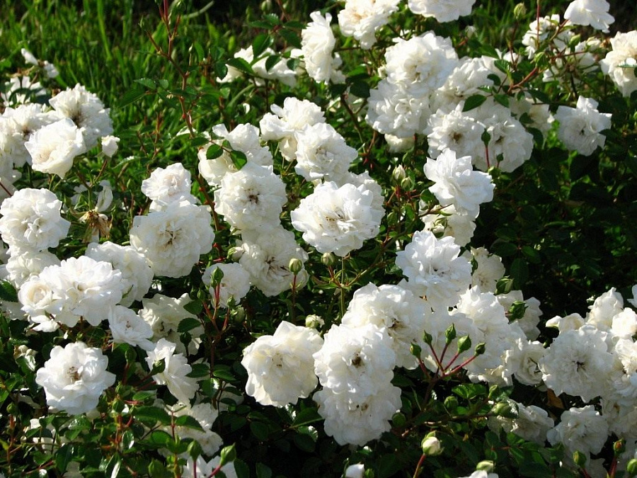 Саженцы розы почвопокровной Sea Foam идеально подходят для невысокой живой изгороди, использования как почвопокровного растения или создания каскада на склоне. Культура хорошо растет в полутени и на не очень богатых почвах. Высота куста 60-100 см, а ширина – 100 см. Цветы появляются на колючих, длинных, поникающих побегах в больших соцветиях. Бутоны небольшие, диаметром 5-6 см, бело-кремовые с небольшой розовинкой. Цветет роза почвопокровная Sea Foam с конца мая и до осенних заморозков.