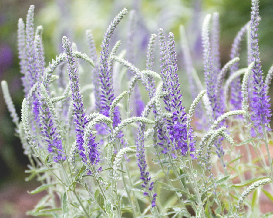 Рассада вероники Седая (Incana) имеет небольшие листики, которые расположены на войлочно-опушенных крепких стеблях. В середине июня появляются темно-синие цветы, которые представляют собой колосовидную форму. Цветение радует приблизительно около 40 дней. В высоту растет 25-35 см. Достоинства растения: