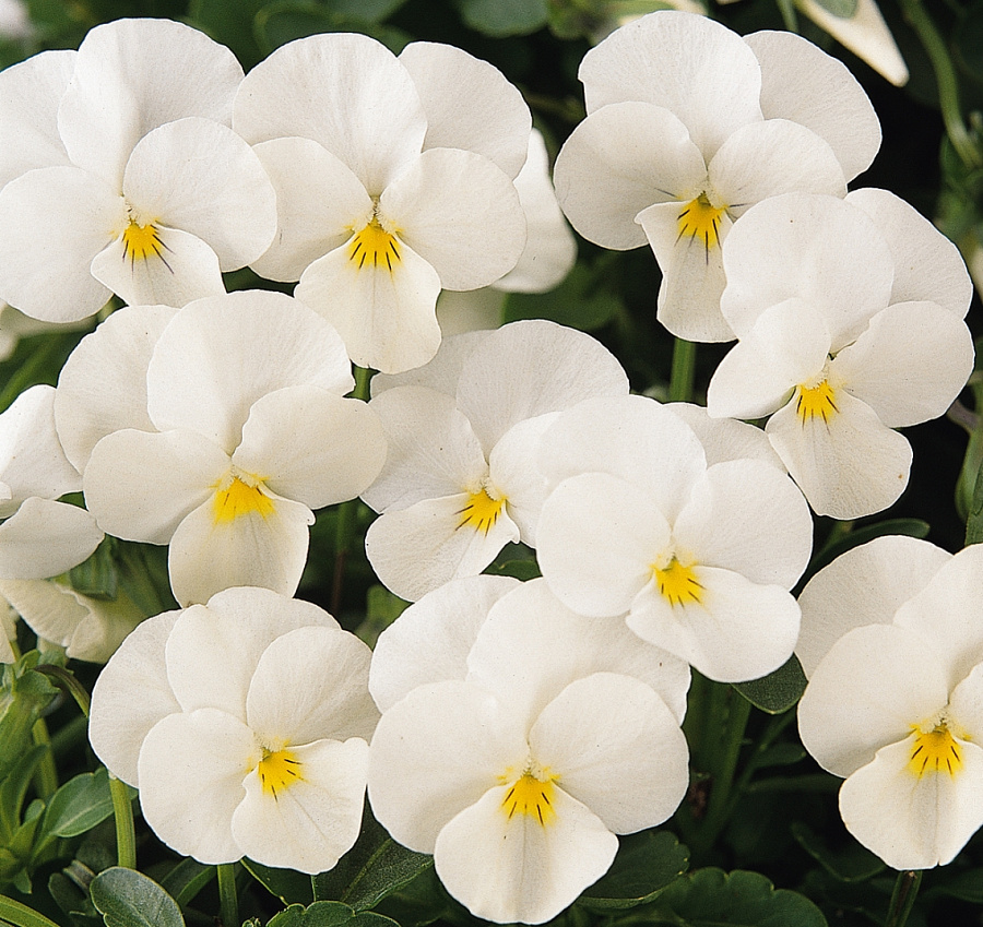 Листья виолы крупноцветковой экстрада вайт имеют ярко-зеленый оттенок и создают прекрасный контраст с белыми цветками. Растение предпочитает солнечные участки с полутенью, а также плодородные почвы. Для обильного цветения рекомендуется регулярный полив и удобрения в период активного роста.